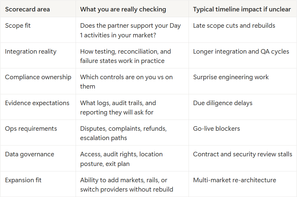 For each option, assign three ratings: build dependency risk, compliance dependency risk, and operational maturity requirement (Low, Medium, High). If any category is High, it does not mean you should not proceed. It means you should avoid making that choice the blocker for building the product core.